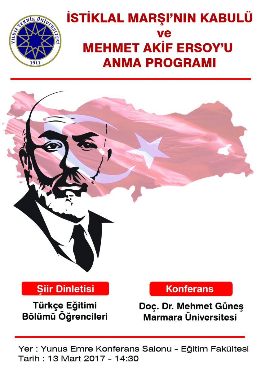 13 Mart 2017 Pazartesi günü saat 14:30'da Doç. Dr. Mehmet Güneş'in konuşmacı olarak katılacağı "İstiklal Marşı'nın Kabulü ve Mehmet Akif Ersoy'u Anma Programı" adlı etkinlik düzenlenecektir.
